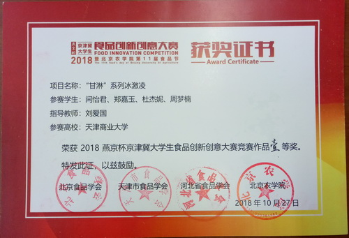 10月27日,2018“燕京杯”京津冀大学生食品创新创意大赛在北京农学院举办。永利官网生物技术与食品科学学院刘爱国教授指导的“冰果消消健”团队“甘淋”系列冰激凌作品荣获一等奖。抹茶醉贵妃团队荣获展示作品最佳人气奖和展示作品优秀奖,依旧Still团队、半夏酿团队荣获展示作品优秀奖。