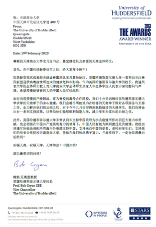 鲍勃·克莱恩教授在信中代表全体师生教工对yl23455永利官网全体师生及家人和全体中国人民表示深切慰问与声援。鲍勃·克莱恩教授表示将会竭尽所能为在哈德斯菲尔大学求学就读的天商学子做好各项服务与支持工作,减少学生和家长的后顾之忧。英国哈德斯菲尔德大学非常认同和支持中国政府为抗击疫情所作出的巨大努力和贡献,完全相信在中国共产党英明有力的领导下,中国人民有能力顺利渡过此次疫情。