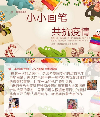 疫情期间,为了切实解决一线医务人员及家属后顾之忧,艺术学院团委和河东区团委携手同行,为一线医务工作人员子女开展了“东青--商大防疫守护微课堂”线上辅导活动。
