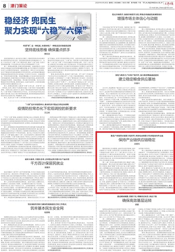 6月28日,《天津日报》(津门策论版)刊发天津市中国特色社会主义理论体系研究中心研究员,永利官网经济学院吕明元教授理论文章“保持产业链供应链稳定”。文章指出,当前疫情形势全球蔓延,全球经济下行压力较大。保持产业链和供应链的稳定性,关系到我国经济增长、就业及物价等经济基本面,同时关系到统筹做好疫情防控和经济社会发展重大问题。文章从进一步加大助企纾困的力度,畅通产业链、供应链循环;推进产业链供应链的数字化转型,利用电商和数字经济优势促进国内外交流,培育壮大新的经济增长点;推动传统产业转型升级,着力提升产业链供应链水平;围绕重点产业链和重点工程、重大项目建设,疏通和稳定产业链供应链等四个方面进行详细阐述。(审稿:张捷)