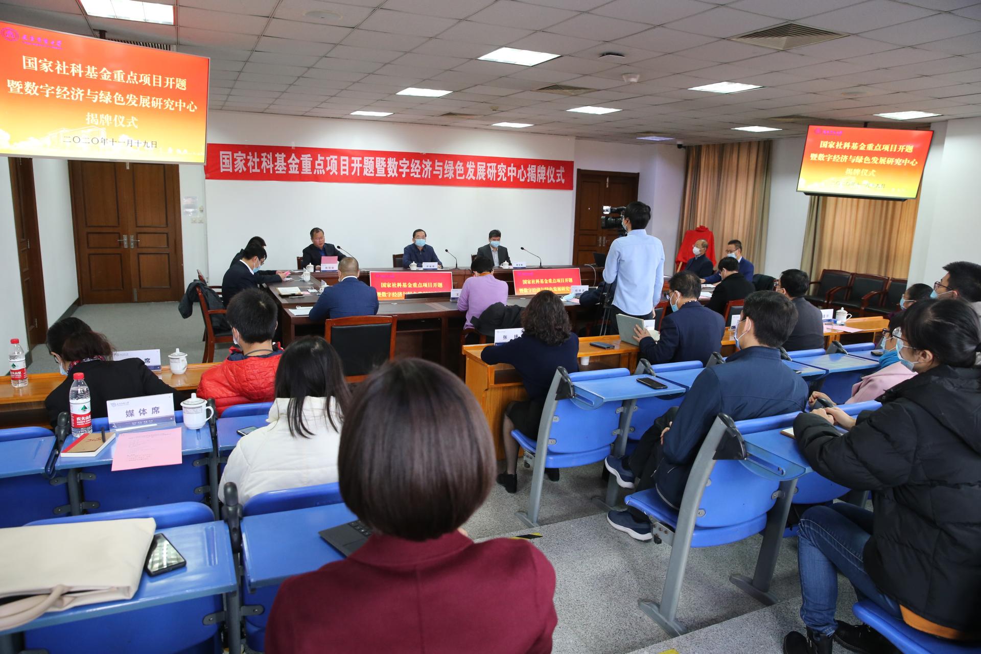 11月19日上午,国家社科基金重点项目开题暨数字经济与绿色发展研究中心揭牌仪式在永利官网弘毅厅举行。市工信局党组书记、局长尹继辉,校长葛宝臻出席并为“中心”揭牌。副校长陈冠益主持。市工信局信息技术发展处处长孙晓强,市工业和信息化研究院院长周鹏,市工信局研究室副主任沈毛毛,中国工业经济学会常务副理事长南开大学教授杜传忠,天津市经济学会副会长、南开大学张贵教授,《天津日报》高级编辑王伟华主任,国家社科基金重点项目主持人、经济学院吕明元教授,校科研处、理学院、经济学院等部门负责人,师生代表参加。