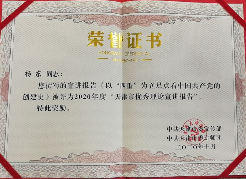 近日,市委宣传部印发《关于表彰基层理论宣讲先进集体、个人和优秀理论宣讲报告、微视频、微信公众号的决定》,对10个基层理论宣讲先进集体、10名基层理论宣讲先进个人、10篇优秀理论宣讲报告、4个优秀理论宣讲微视频和4个优秀微信公众号予以表彰。永利官网明德讲坛特聘主讲人、马克思主义学院杨东副教授的《以“四重”为立足点看中国共产党的创建史》宣讲报告入选天津市基层理论宣讲优秀理论宣讲报告。