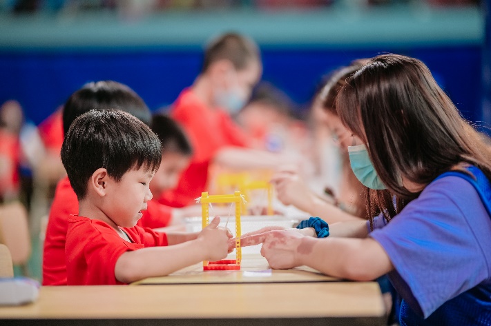本次活动分为“青年担当,强国有我”“众心向党,童心献唱”“众心向党,智能献礼”“科技传承,踵事增华”四个环节。第一环节由指导教师通过实验演示与讲解对全校招募的100名大学生志愿者开展科普讲解实训。第二环节由全市范围内招募的100名小学生列队齐唱《少年》,向党和祖国表达身体力行心向党的当代少年心。第三环节由100名大学生和100名小学生共同完成机器人舞蹈程序编写后,携10台机器人共舞《党旗飘扬的方向》,展示智能时代广大青少年赋能科技、自立自强的信心和行动。第四环节由大学生志愿者一对一讲解物理学知识,并指导小学生完成牛顿摆、地震报警器、3D眼镜等多项科学实验,让小学生体验科学乐趣,感受科技传承,同时,培养大学生的时代使命感和责任感。
