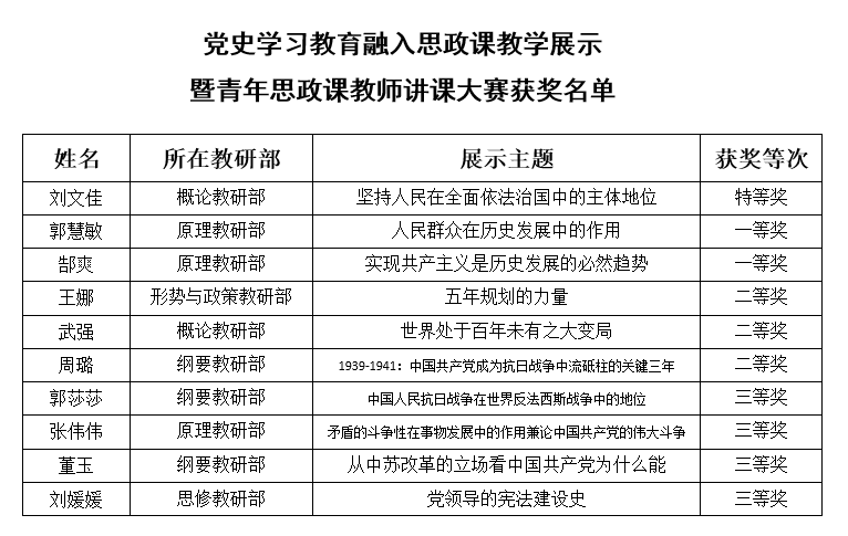 竞赛分为教案设计和现场展示两个环节。参赛教师的教案设计选题多样、角度新颖、内容丰富、扎实规范,涵盖了思政课教学的大部分教学重点,充分将党史学习教育成果融入思政课教学。现场展示环节,来自各个教研部的25位思政课教师逐一登台讲课,充分挖掘党史蕴含的育人功能,结合各门课程的教学难点,努力把“最难讲”的课上得“最精彩”,获得了评委的一致好评。10名教师最终分获特等奖和一、二、三等奖。