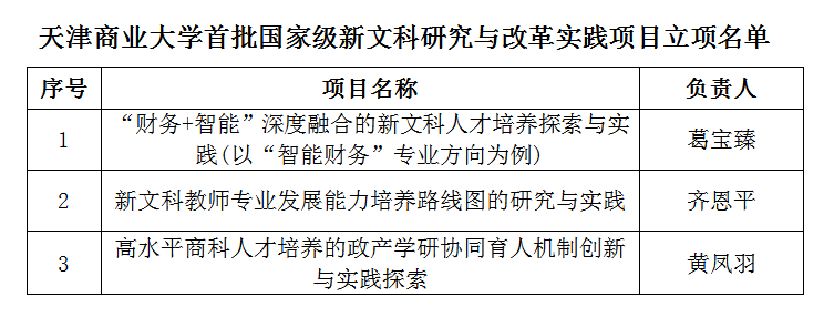 本次获批的3个项目分别从传统财经专业与新兴智能技术交叉融合改造与实践、新文科背景下教师专业发展探索与实践、商科人才培养的政产学研协同育人机制创新与实践3个方向展开研究,融合了学校“商科”办学特色。其中,2个项目获天津市教委遴选推荐,1个项目获教育部高等学校电子信息类专业教学指导分委员会遴选推荐。