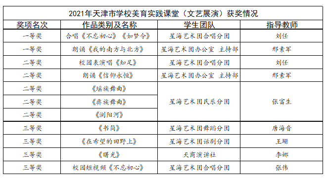 近日,由天津市教育委员会主办的天津市学校美育实践课堂(大学生文艺展演)获奖结果公布,永利官网选送的11个项目全部获奖。其中,合唱《不忘初心》《如梦令》、朗诵《我的南方与北方》荣获大学组一等奖;民乐演奏《瑶族舞曲》《彝族舞曲》《浏阳河》、校园表演唱《知足》、朗诵《信仰永恒》荣获大学组二等奖;舞蹈《书简》、话剧《在希望的田野上》、朗诵《曙光》、校园短视频《不忘初心》荣获大学组三等奖。