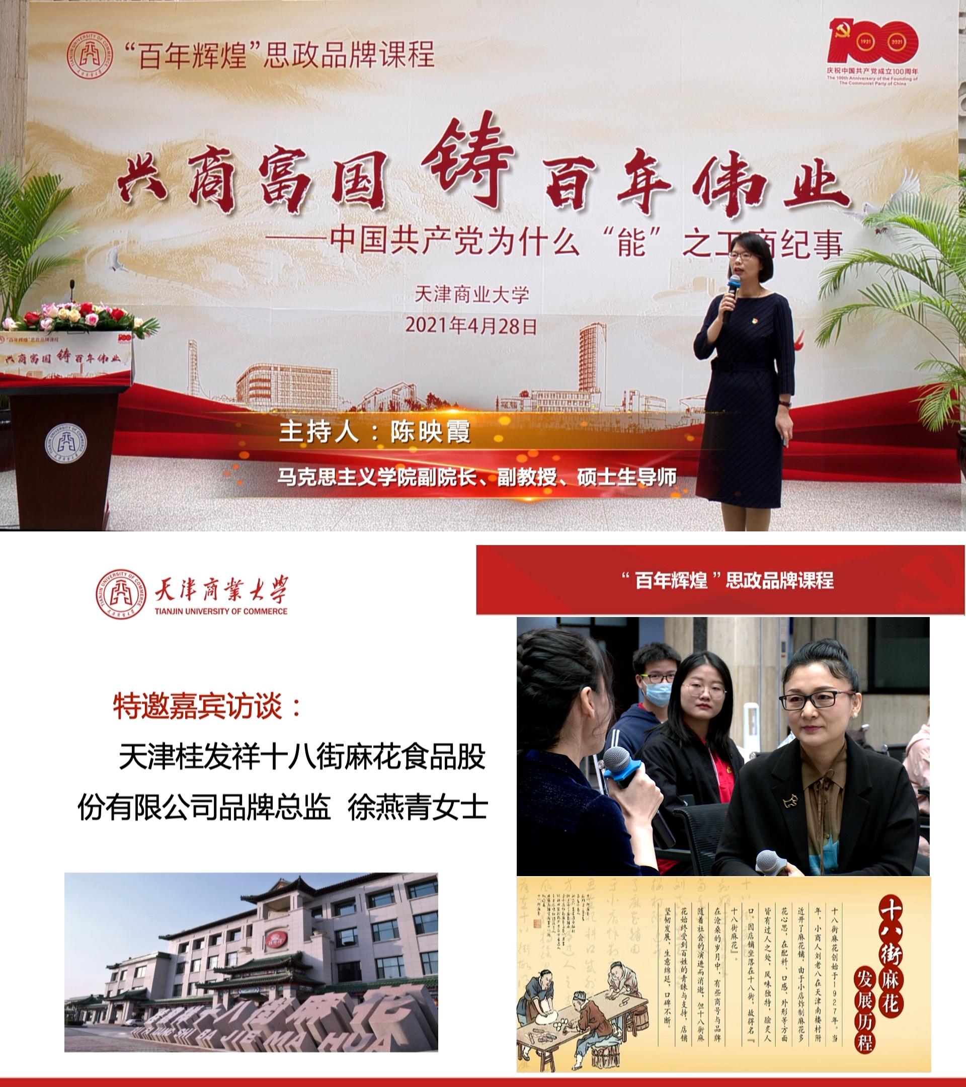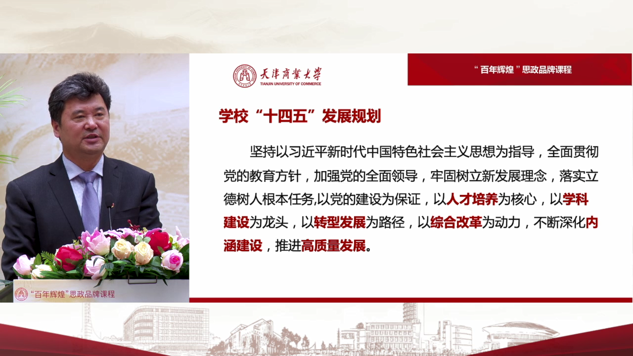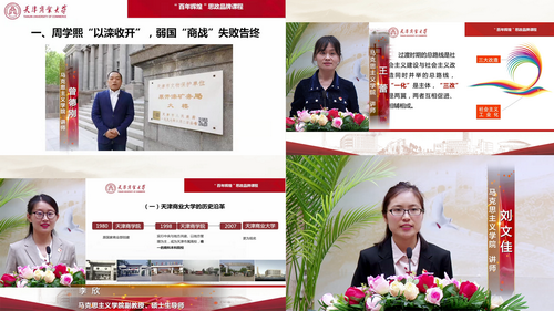 本课程由校长葛宝臻教授、副校长陈冠益教授领衔讲录,在党委宣传部、发展战略研究室、图书馆、国有资产与实验室管理处等部门大力支持下,马克思主义学院成立专门教学团队,集思广益,反复研讨,几易其稿,历时4个月,先后完成教案编写、外景拍摄、授课实录、后期剪辑等各项工作。该课程分为《国不强 商难兴》《新中国 商初立》《改革潮 筑商道》《新时代 新商科》4个篇章,以建党百年风云激荡的近现代史为背景,讲述了近代以来,中国工商业尤其是天津工商业的曲折发展历程,深刻阐述yl23455永利官网依商而建、因商而兴的蓬勃发展过程,深刻阐明了只有在中国共产党的正确领导下,中国工商业才能真正兴旺繁荣、蓬勃发展的道理。