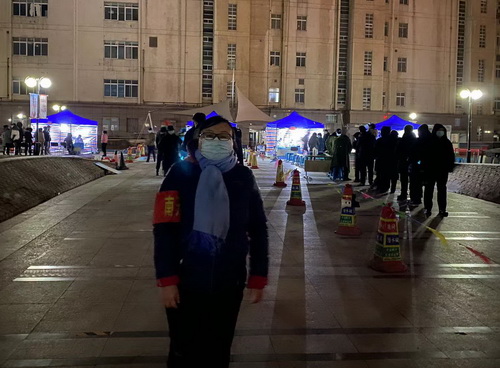 1月13日下午5点半,张莉收到社区电话,紧急赶往北辰区瞰景园社区居委会报到。到达二筛现场后,她立即投入到志愿活动中。在社区筛查现场,每位居民都持有一张号码条,为了防止号码条被二次使用,她负责提醒筛查后居民及时将小条扔到垃圾箱。此外她还主动承担秩序维护、道路指引等工作。