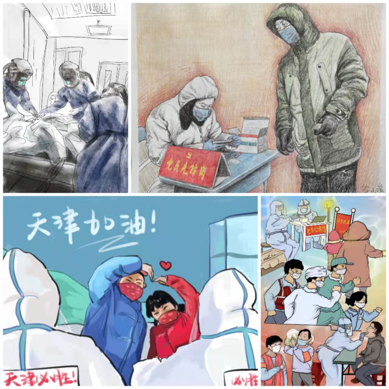 目前展出的作品中,庄雪阳老师用中国没骨花鸟画作品《抗疫有我 静待花开》向一线医务工作者、社区工作者和志愿者致敬。马鸿民老师用书法作品《凝心聚力共抗疫情》表达津城人民众志成城抗击疫情的坚定决心和信念。梁健老师创作了水墨作品《守护》,旨在宣传科学防疫的重要性,坚定全民团结一致、抗击疫情的意志。王超老师用水墨作品《送战友》记录一线医务工作者争分夺秒地奋战在抗疫一线的感人瞬间,为抗疫胜利打气加油。学生党员毕天叆用速写作品《永远冲在第一线》向勇挑重担、冲锋在前的一线下沉党员干部致敬。学生党员孙岳华用插画作品《最美大白》向在一线奋战的医护人员表达感谢之情,致敬在疫情防控中的逆行者……艺术学院师生以赤子之心述说家国情怀,以笔传情向战斗在抗疫一线的英雄们致敬,向社会展示了艺院师生的情怀与社会担当。