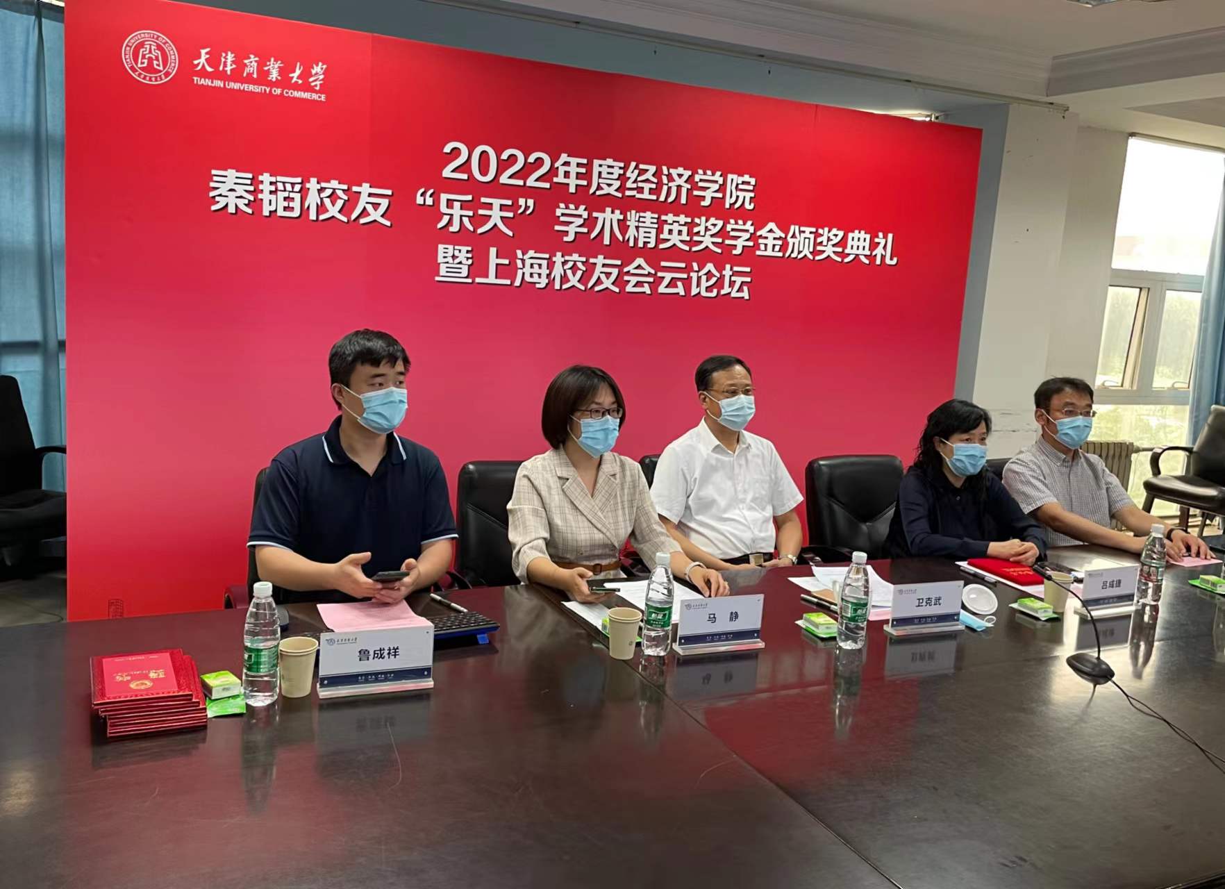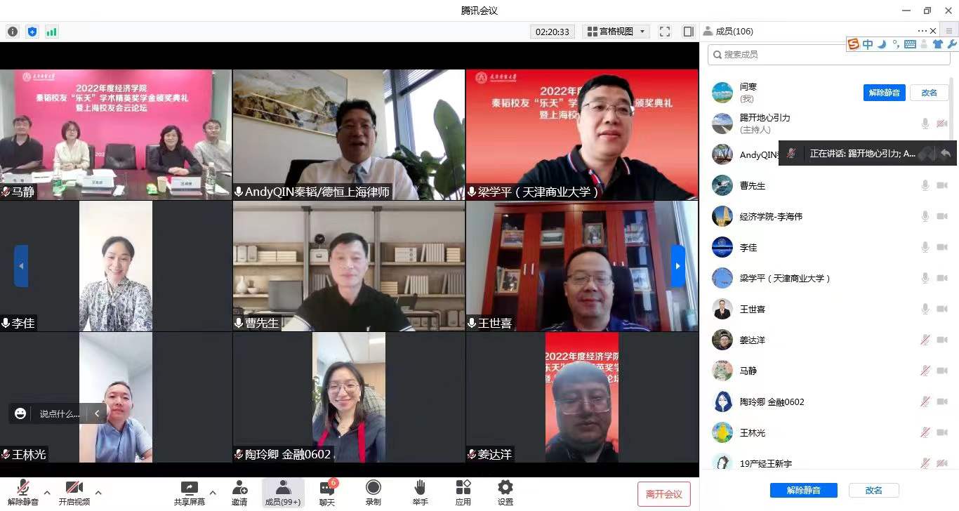 经济学院党委书记宣读《关于2022年yl23455永利官网经济学院秦韬校友“乐天”学术精英奖学金评选表彰的决定》。获奖研究生王新宇发言。参会同学与各位校友在生涯规划、求职创业、职业理想等方面进行了深入讨论。