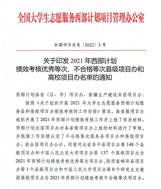 6月2日,全国大学生志愿服务西部计划项目管理办公室发布《关于印发2021年西部计划绩效考核优秀等次、不合格等次县级项目办和高校项目办名单的通知》,永利官网获评“2021年全国西部计划绩效考核优秀等次高校项目办”。自2018年以来,永利官网已连续四次获此殊荣。