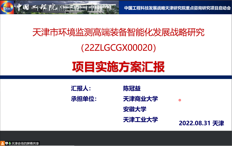 会上,陈冠益教授从国家相关政策、区域发展现状、产业园区发展、环境监测新要求等方面对项目背景、具体实施方案、预期成果进行了汇报,并提出如何判定环保技术发展与环境监测产业之间的内在联系、如何识别并发挥天津本地的优势与特色、新时代背景下环境监测技术与装备有何新需求以及如何保障提出建议的更好落地的四点思考。