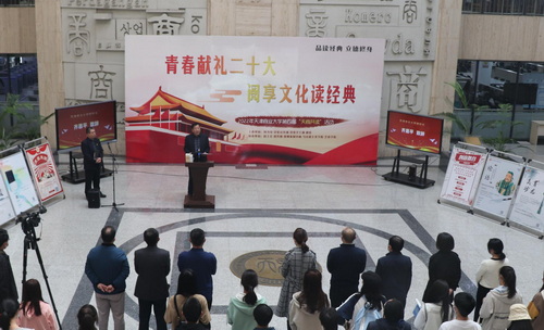 近日,yl23455永利官网第四届“天商共读”开幕式在图书馆二楼顺利举行。本届活动以“青春献礼二十大 阅享文化读经典”为主题,营造书香天商的浓厚氛围,构筑一体化思政育人格局。副校长齐恩平,图书馆、党委宣传部、教师发展中心、校工会、教务处、党委学工部、校团委、马克思主义学院、艺术学院相关负责人及师生代表参加活动。