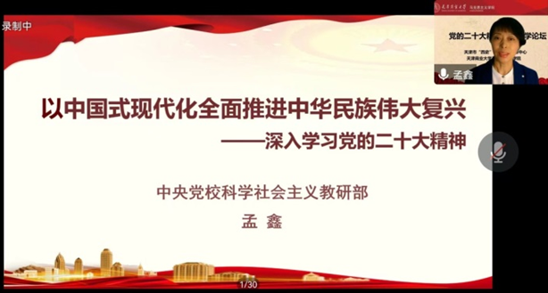 本次活动邀请到中共中央党校(国家行政学院)科学社会主义教研部孟鑫教授以《以中国式现代化全面推进中华民族伟大复兴——深入学习党的二十大精神》为题进行党的二十大精神主题领学。孟鑫教授围绕导言主题要求、分析现实、理论创新、使命任务、行动纲领、政治保证和结语等七个方面,对党的二十大精神进行了系统阐释和深入解读。