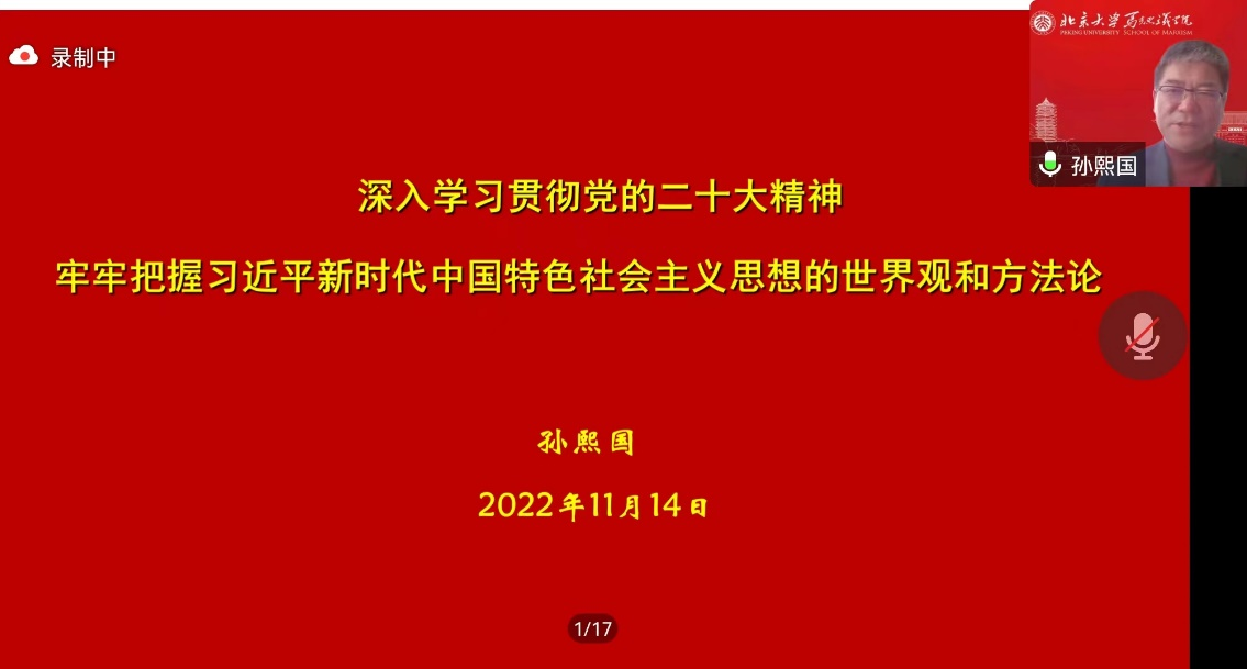 本次活动邀请北京大学马克思主义学院孙熙国教授以《深入学习贯彻党的二十大精神,牢牢把握习近平新时代中国特色社会主义思想的世界观和方法论》为题进行党的二十大精神主题领学。孙熙国教授围绕如何理解世界观和方法论、如何理解原创性贡献、 “六个必须坚持”为什么是世界观和方法论层面的原创性贡献等方面,对习近平新时代中国特色社会主义思想的世界观和方法论进行了系统阐释和深入解读。