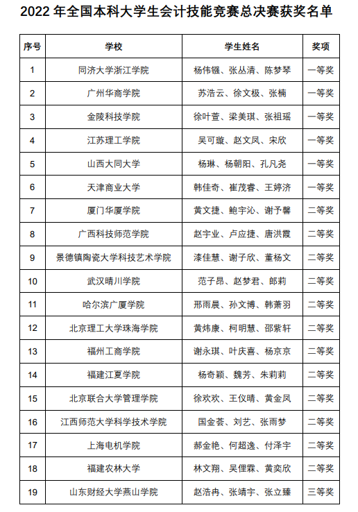 近日,全国本科大学生会计技能竞赛官方公布了2022年总决赛竞赛结果,会计学院赵惠萍老师指导的财务管理专业学生团队韩佳奇、崔茂睿和王婷济,于10月底夺得大赛(北区)区域赛一等奖后,获决赛一等奖。