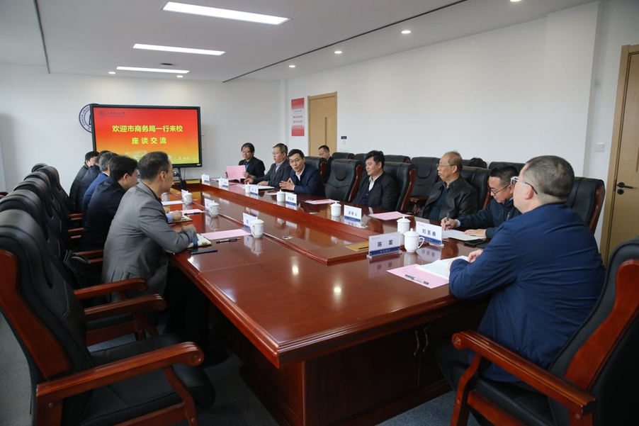 3月20日上午,市商务局副局长李建一行5人来校座谈交流。校党委书记张亚主持,校党委副书记、校长葛宝臻,副校长陈冠益出席。