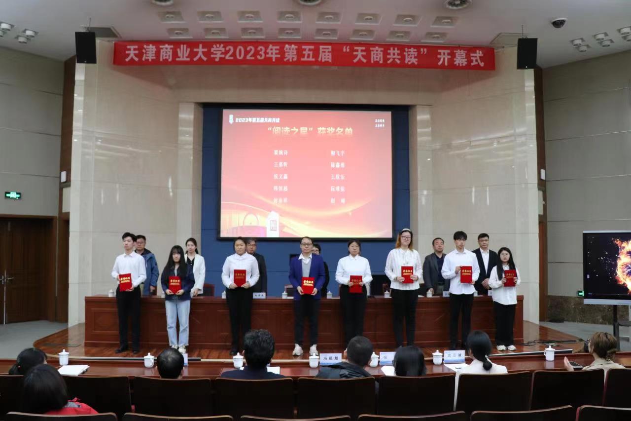 图书馆主要负责同志首先对2022年第四届“天商共读”赓续红色文化,传承经典文化,开展了“喜迎二十大书籍伴成长——阅读·悦心·越己”系列读书活动进行了总结。随后,他介绍了本届“天商共读”的活动选定共读书目为《周恩来:永远的榜样》和《天津文化地图》,以在天津求学的伟人周恩来总理传记为基点,传承伟人精神,勇担时代大任;以热爱我求学的城市天津地域文化为原点,体验城市变迁,服务天津建设。图书馆将通过“天商共读”阅读推广系列活动,引导激励广大师生爱读书、读好书、善读书,积极推广优质阅读资源,深入推进全校阅读,有效提升阅读质量。随后,参会领导为首月荣获“阅读之星”的师生颁奖。六十多名学生代表齐诵《少年中国说》,铿锵有力地朗诵,抒发爱国之情,表达报国之志。黄凤羽开启倒计时仪式后,第五届“天商共读”系列活动正式拉开帷幕。