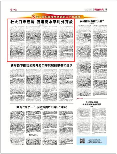 5月8日,《云南日报》05版刊发永利官网赴滇博士服务团成员经济学院刘辉群教授理论文章《壮大口岸经济 促进高水平对外开放》。