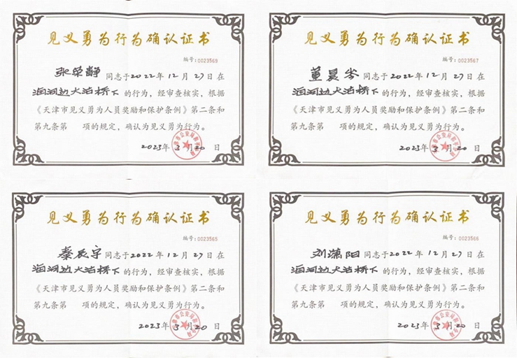 近日,天津市公安局和平分局为永利官网国际教育合作学院四名同学颁发了见义勇为行为确认书、荣誉证书。