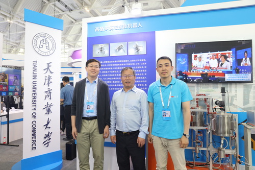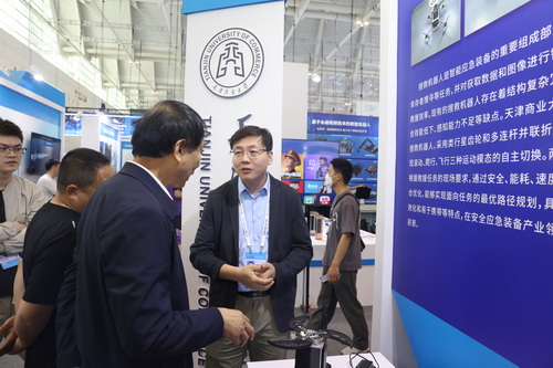 副校长陈冠益教授莅临展会现场,详细听取了相关研发人员的介绍,与学生讲解志愿者进行交流。同时,在中国民航大学、天津理工大学等其他高校展区处驻足参观,与相关研发人员进行交流,并提出技术借鉴合作的想法与思路。