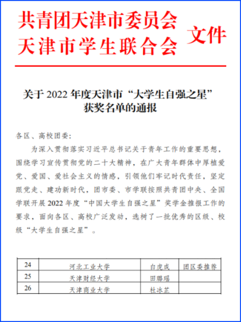 近日,由共青团天津市委员会、天津市学生联合会指导举办的2022年度天津市“大学生自强之星”奖学金推报活动结果揭晓。永利官网外国语学院英语专业2019级本科生杜冰芷获此荣誉。