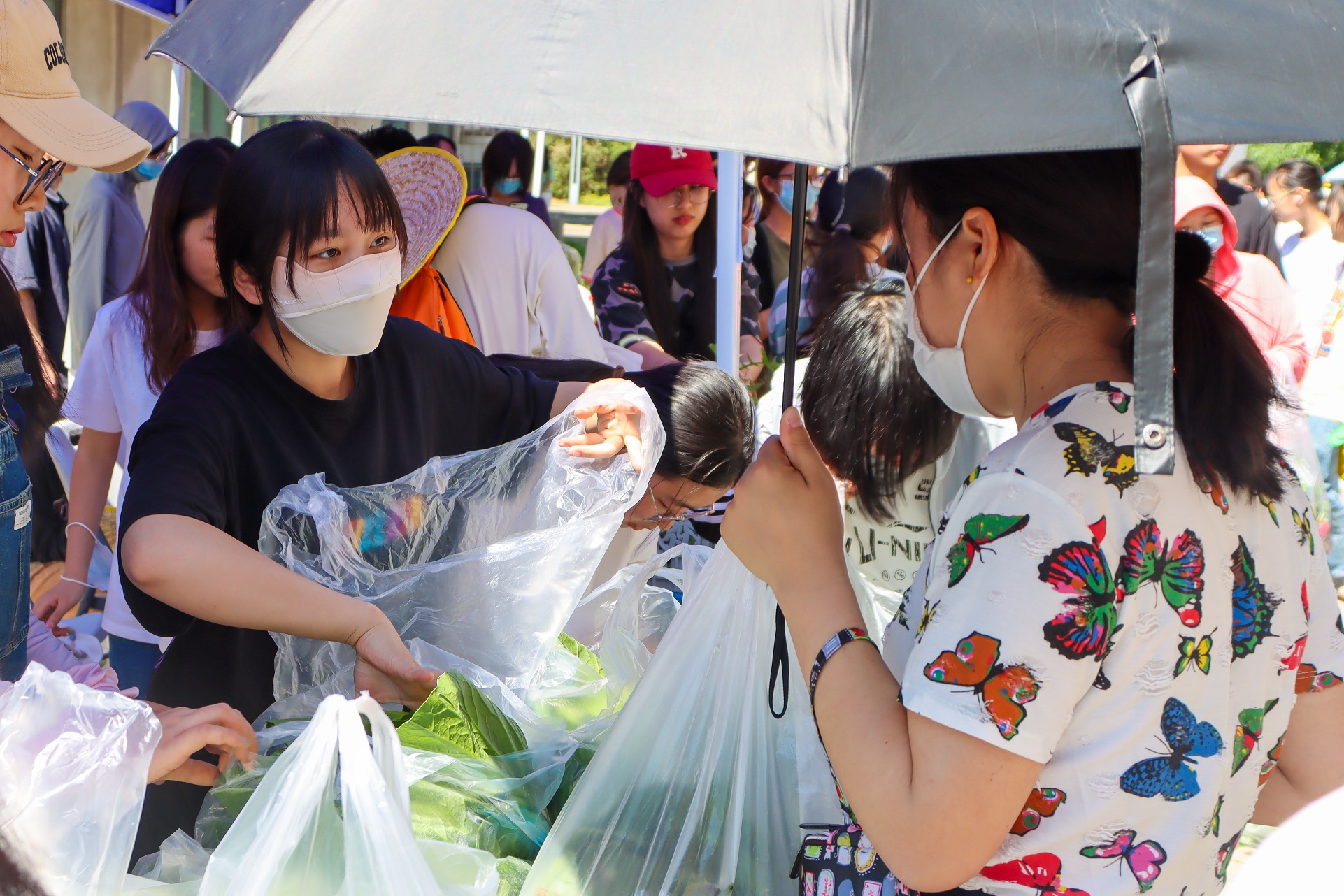 集市现场以学院为单位设置12个售卖点,同学们将亲手种植并采摘的蔬菜以“两元一包”“五元一包”的“亲情价”售卖给学校老师,老师们现场品尝、慷慨解囊,纷纷以实际行动表示对同学们劳动成果的认可与支持,每个摊位前人流涌动、摩肩接踵,此次蔬菜集市提供黄瓜、辣椒、油菜、菠菜、小白菜、樱桃萝卜等6种常见蔬菜,当天上午共采摘售卖蔬菜超过3500斤。
