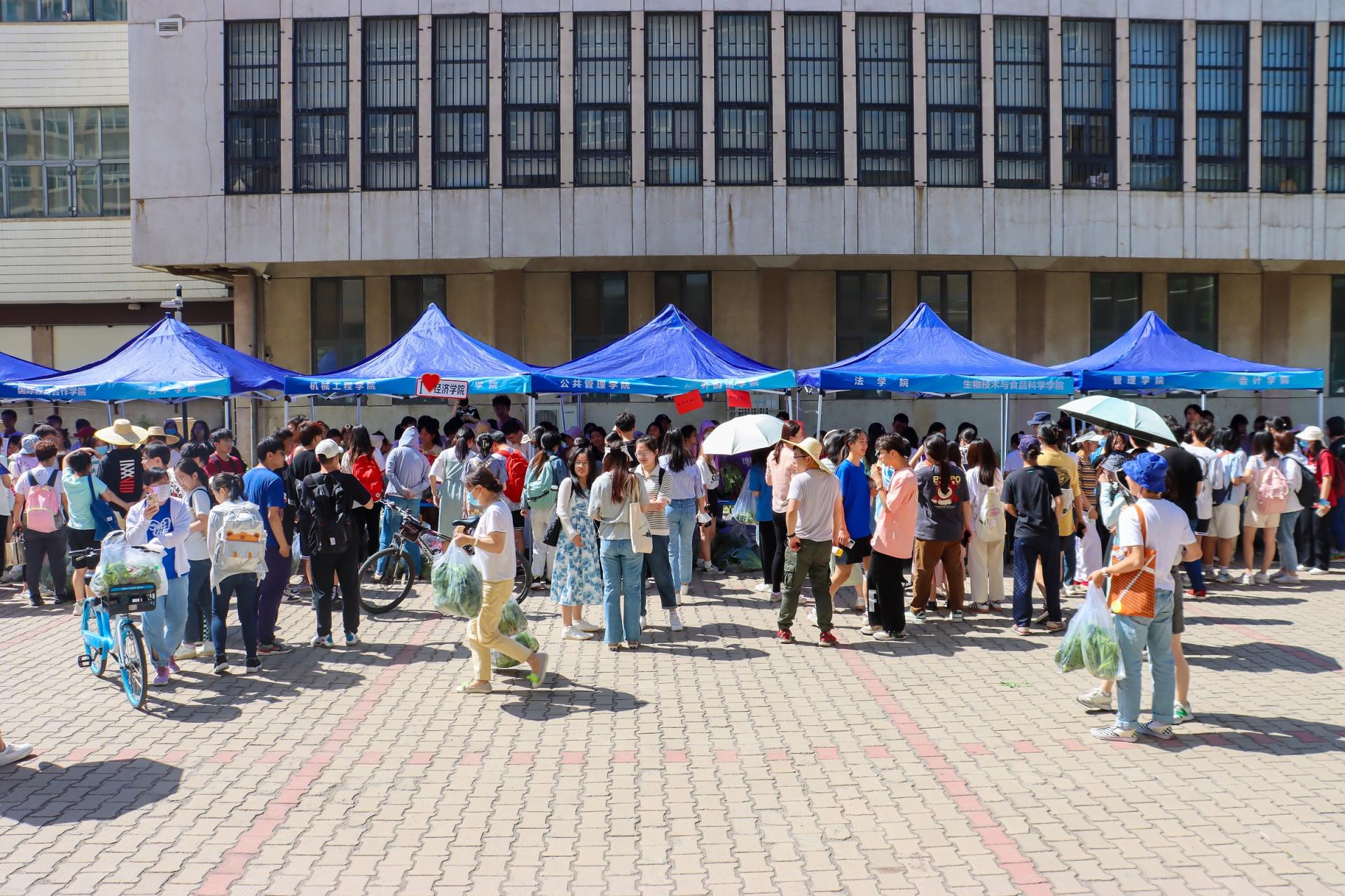 6月2日上午,党委学工部在四号教学楼南侧空地举办第一期“天商农场蔬菜集市”活动。各学院组织学生将当天新采摘的蔬菜运至集市现场,将“天商农场”首批劳动成果与全校师生共同分享。
