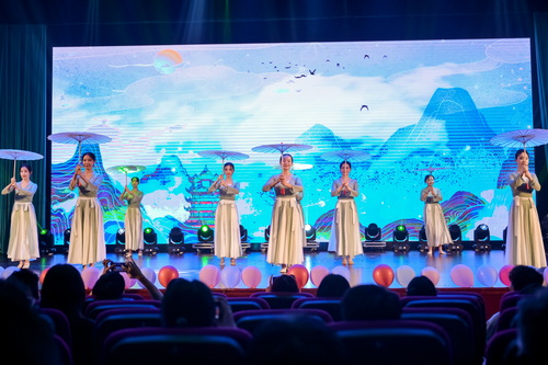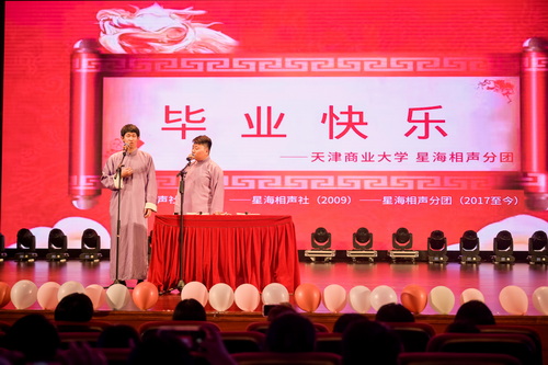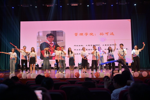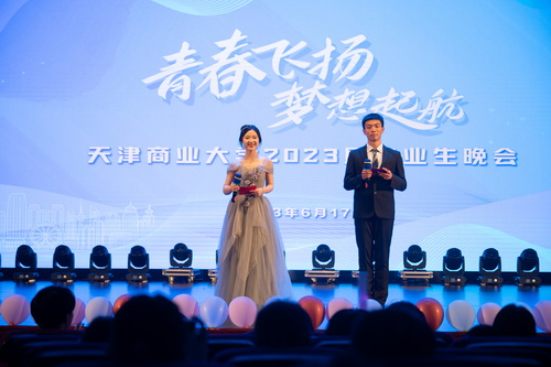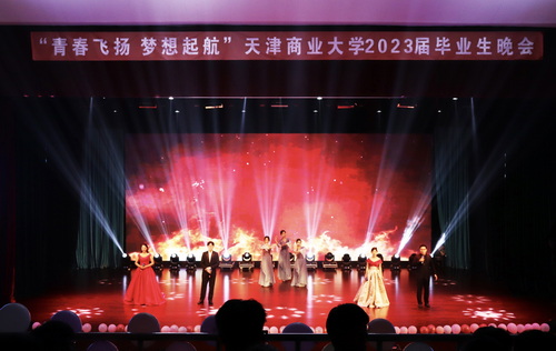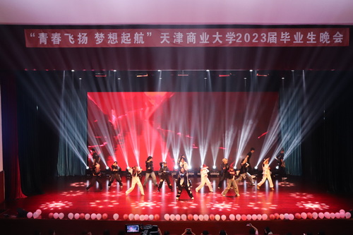 活动在开场视频《愿你前程似锦,归来仍是少年——致yl23455永利官网2023届全体毕业生》拉开了序幕。晚会共分为“筑梦—忆·相逢有时”“逐梦—恰·同学少年”“圆梦—铸·青春梦想”三个篇章,每个篇章用视频引出,视频中每一幅熟悉的画面,每一句真挚的话语都表达着毕业生们对天津、对天商的留恋与不舍,对母校的感恩与祝福。晚会通过歌曲、舞蹈、朗诵、光影剧、相声、魔术等19个形式多样的节目,展现了天商学子朝气蓬勃、青春向上的精神风貌,为现场观众带来了一场视听盛宴。