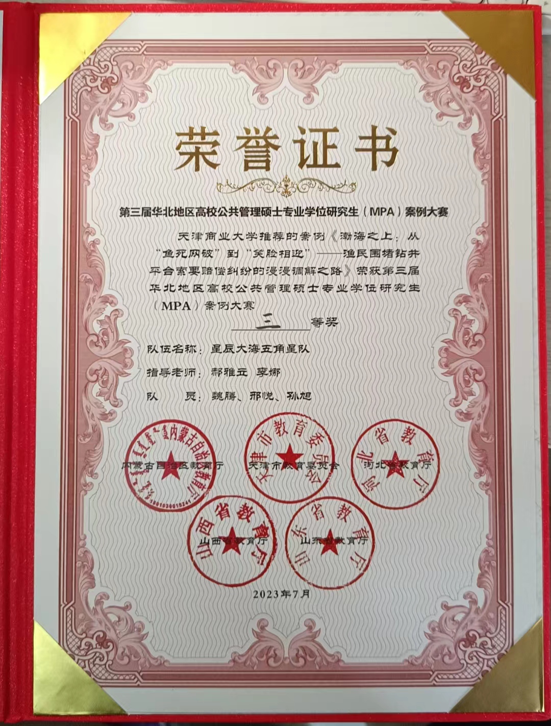 7月29日,第三届华北地区高校公共管理硕士专业学位研究生(MPA)案例大赛决赛在呼和浩特市举行,由永利官网公共管理学院郝雅立老师、李娜老师指导的,公共管理2022级学术型硕士魏腾,专业型硕士邢悦、孙旭三位同学组织的团队案例《渤海之上:从“鱼死网破”到“笑脸相迎”——渔民围堵钻井平台索要赔偿纠纷的漫漫调解之路》荣获大赛三等奖。
