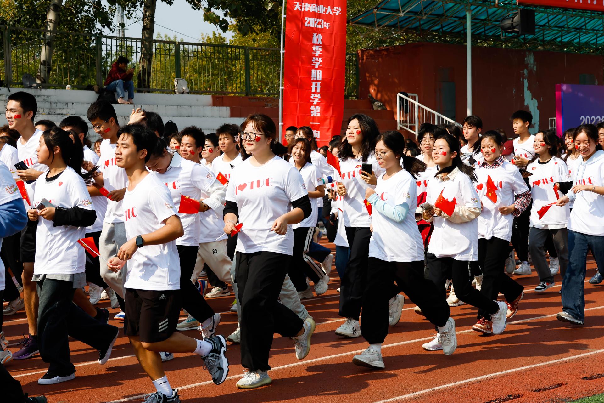 张亚宣布“开学第一跑”活动正式开始。伴随着发令枪一声枪响,700余名着装整齐的师生在由校领导、教师代表、学生代表组成的领跑团的带领下激情开跑,现场气氛振奋热烈,青春激昂,成为初秋校园中一道亮丽的风景线。活动最后,全体师生挥动国旗,在星海艺术团合唱团的带领下齐唱《我和我的祖国》。