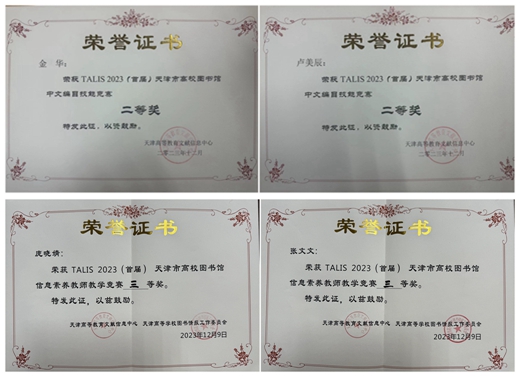 12月7日、9日,由天津市教委指导,天津市高校文献信息中心(TALIS)、天津高等学校图书情报工作委员会主办的TALIS 2023(首届)天津市高校图书馆中文编目技能竞赛和信息素养教师教学竞赛分别在天津师范大学、天津医科大学举办。永利官网图书馆金华、卢美辰老师在中文编目技能竞赛中获二等奖,庞晓婧、张文文老师在信息素养教师教学竞赛中获三等奖。