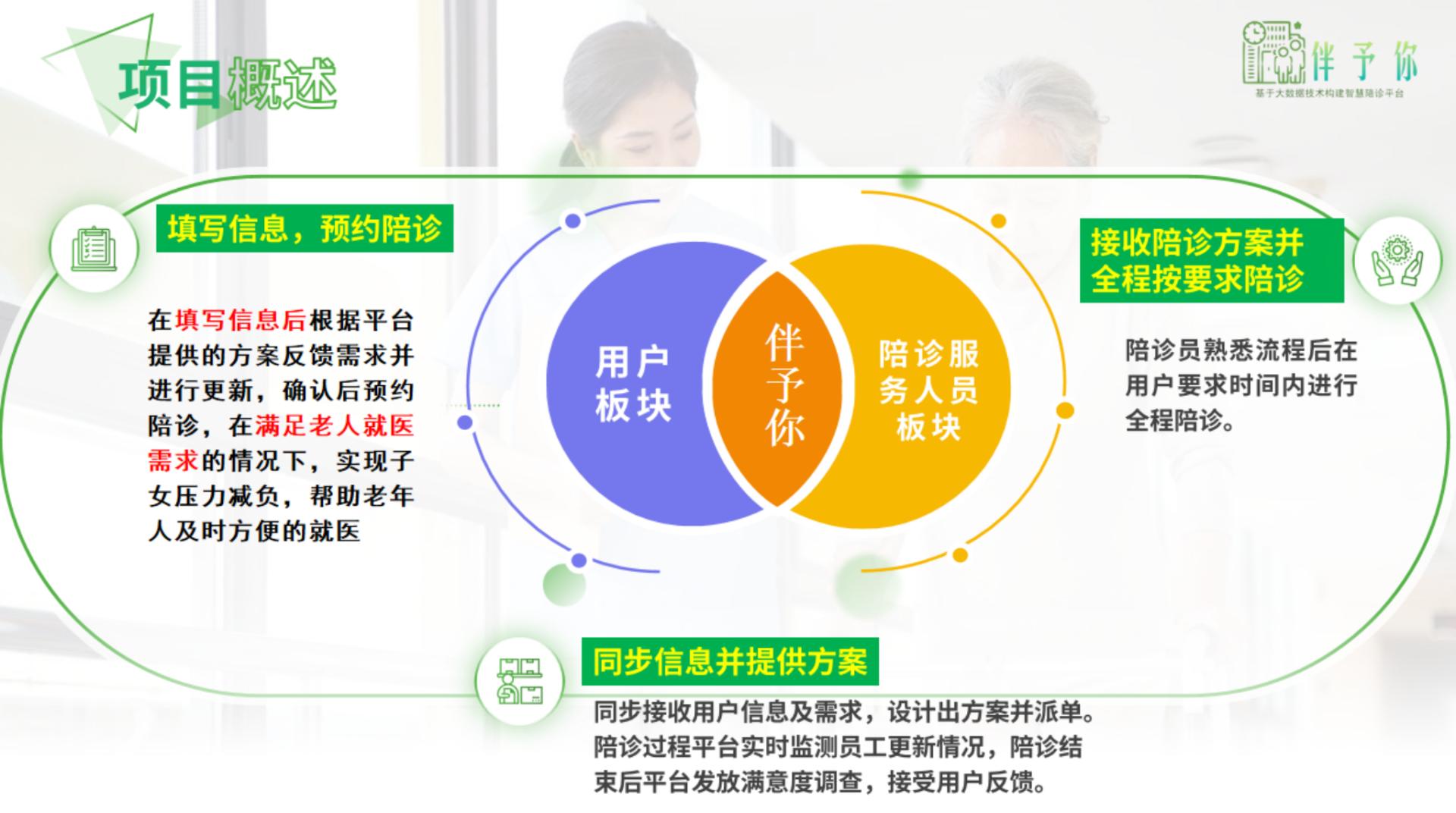 “伴予你”项目负责人为永利官网管理学院21级工程管理专业王琳、会计学院21级会计专业曹聪聪(指导教师:郭海燕、张金娟),项目针对目前就医陪诊市场现状,借助当前大数据技术与生成式AI智能技术构建出一款智慧陪诊平台。该平台以天津市为试点,逐步向其他城市辐射发展,重点解决对就医流程不了解、就诊不便、家人无法陪伴看病、重疾或有特殊照顾需求的老人、异地看病群体等的就医需求。平台支持定制化服务,支持参与群体间实时交流与智慧管理,具备多元营销与运营通道,使得患有疾病的老人、外地患者等就医看病更加高效便捷。该平台积极响应国家的智慧养老政策,设计和推行符合国家科研和产业布局计划,将进一步推动国内陪诊产业的智能化发展。