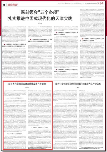 1月5日,《天津日报》“理论创新”专版刊发永利官网经济学院院长梁学平教授理论文章《以扩大内需增强天津高质量发展内生动力》。