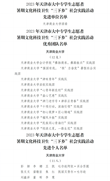 1月4日,天津团市委下发了《关于2023年天津市大中专学生志愿者暑期文化科技卫生“三下乡”社会实践活动的通报》,永利官网“彝脉商承,彝路振兴”实践团等12支团队被评为优秀团队,彭妍等11名老师被评为先进个人,校团委被评为先进单位。