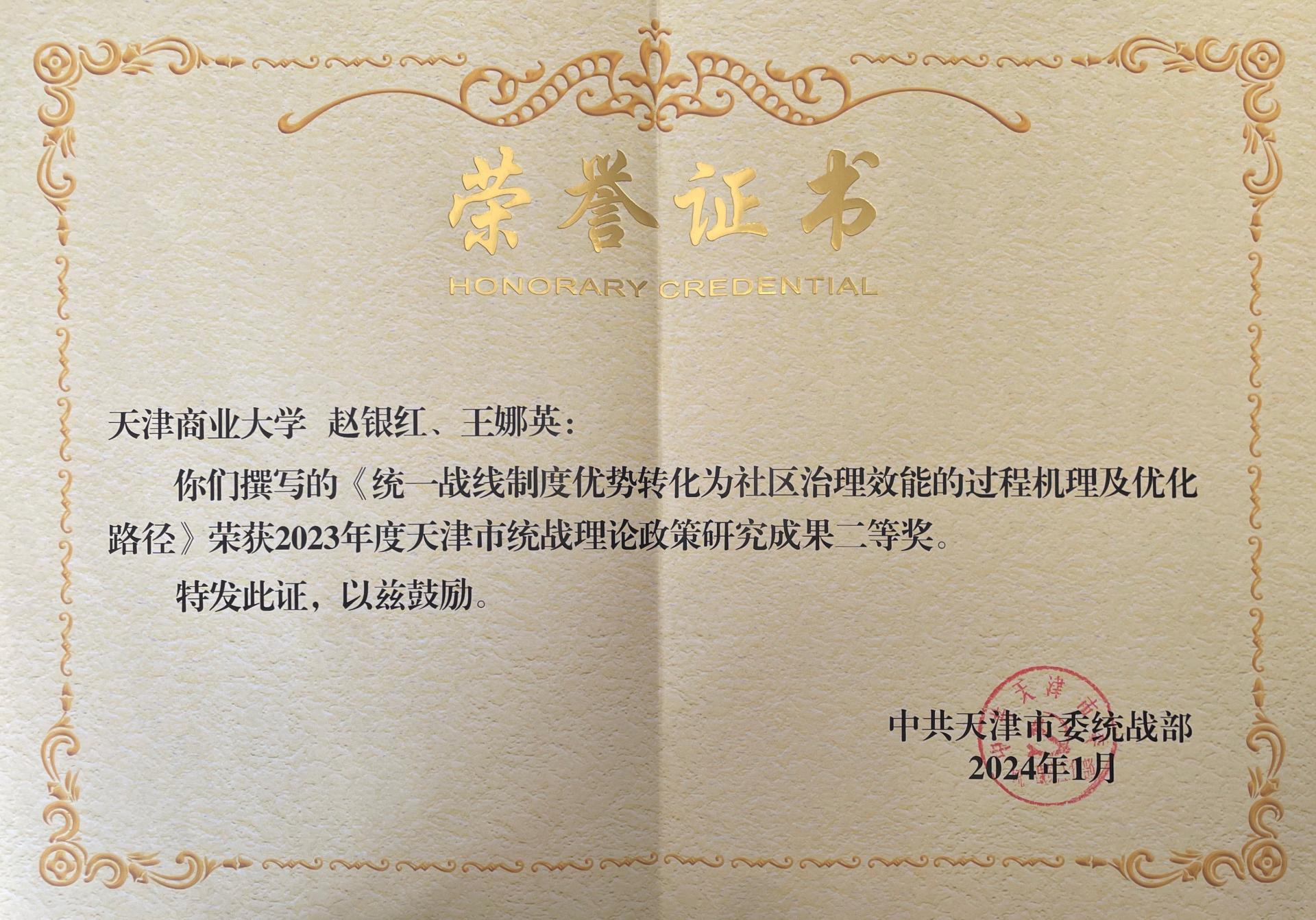 自2023年度成果申报工作启动以来,永利官网教职工积极参与、精心选题,有组织开展统战理论政策与实践工作研究创新,共申报成果12项。其中,由党委统战部完成的《立足“四心” 下好“四步棋” 推动党外人士发挥作用取得新成效》获天津市统战工作实践创新成果,由公共管理学院赵银红、王娜英完成的《统一战线制度优势转化为社区治理效能的过程机理及优化路径》获天津市统战理论政策研究成果二等奖。