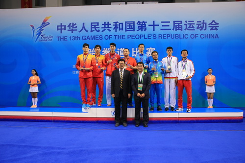 中国跆拳道协会主席管健民、江苏省体育局局长陈刚为获奖选手颁发奖牌和纪念徽章