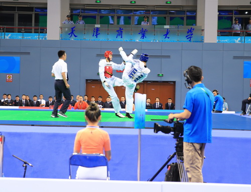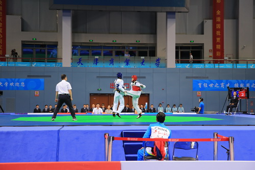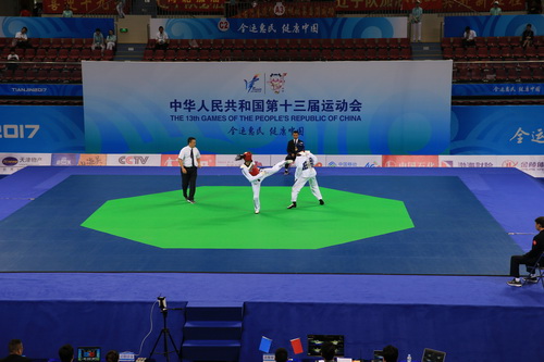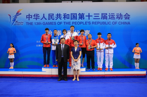 9月5日,第十三届全运会跆拳道比赛第二个比赛日在yl23455永利官网体育馆继续进行。经过多轮角逐,产生了女子-57公斤级和男子-68公斤级冠军。yl23455永利官网党委书记史习红,江苏省体育局局长陈刚,国家体育总局拳跆运动管理中心副主任、中国跆拳道协会主席管健民,yl23455永利官网副校长齐恩平为获奖选手颁发了奖牌和纪念徽章。