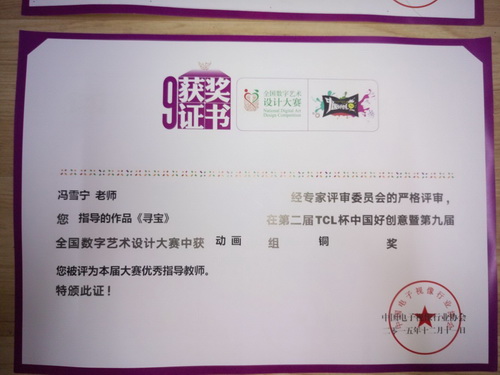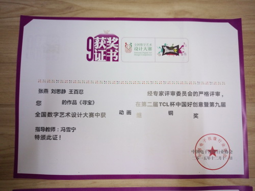 12 月11 日,2015 “中国好创意”——TCL 杯第二届中国高校科学与艺术创意联盟精英赛暨第九届“全国数字艺术设计大赛”在贵州凯里举行颁奖仪式。永利官网设计学院动画专业 13 级学生张燕、刘思静、王百忍的作品《寻宝》荣获铜奖;动画专业12 级学生杨婉、谭圆姣分别获得8 月份、9 月份娱乐创意人气奖;指导教师冯雪宁荣获优秀指导教师奖 。
