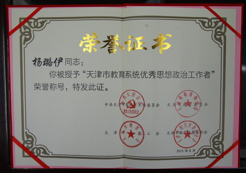 杨璐伊获得“天津市教育系统优秀思想政治工作者”称号