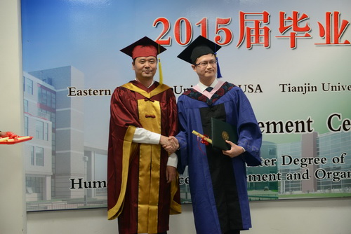 6 月 22 日 上午,yl23455永利官网与美国东密歇根大学 (Eastern Michigan University ,简称 EMU) 合作人力资源管理硕士2015 届学生毕业典礼在图书馆二楼弘毅厅举行。校长葛宝臻出席并致辞,美国东密歇根大学商学院院长 Michael Tidwell 教授 、管理系兼国际项目管理主任 Fraya Wagerna-Marsh 教授、校长助理李真、寇小萱以及永利官网国际交流处副处长王玉婧、教学质量监控中心、国际教育学院领导、任课教师代表参加了典礼,29 名学员喜获美国东密歇根大学理学硕士学位 (MSHRMOD) ,部分学生的家长、家属专程来到现场向毕业生表示祝贺。典礼仪式由国际教育学院副院长齐萱主持。
