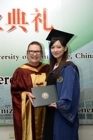 Fraya Wagerna-Marsh 代表 EMU 在 致辞中强调,作为东密歇根大学硕士学位的获得者,每一位毕业生也有资格享有与其它任何公认的硕士学位获得者同等的机会、利益和荣誉,无论是在中国还是北美。享有权利的同时,毕业生们也肩负着巨大的责任,因此必须对自己在伦理道德、公平公正和人格尊严上有更高的要求。最后她再一次祝贺和祝福同学们加入了全球 15 万东密歇根大学校友的行列。