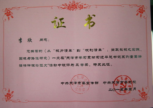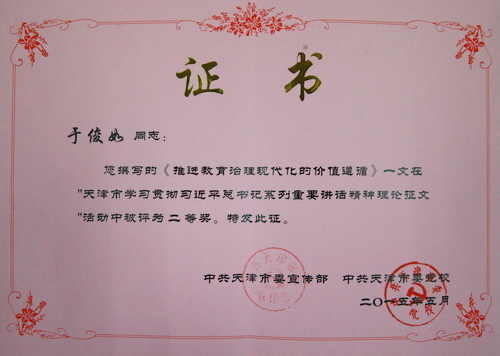 近日,由市委宣传部和市委党校联合主办的天津市学习贯彻习近平总书记系列重要讲话精神理论征文活动评选结果揭晓。永利官网党委宣传部于俊如教授撰写的理论文章《推进教育治理现代化的价值遵循》被评为二等奖,马克思主义学院李欣老师撰写的理论文章《从“权力清单”到“权利清单”:简政放权之实践、困境与路径研究》被评为三等奖。