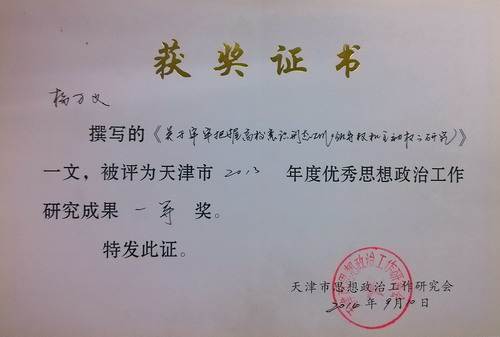 又悉,在 2013 年度天津市高校优秀思想政治工作研究成果奖中,学校选送的 4 项成果全部获奖,其中,一等奖 1 项、二等奖 1 项、三等奖 2 项。校党委副书记杨万义的《关于牢牢把握高校意识形态工作领导权和主导权的研究》荣获一等奖;马克思主义学院张文辉的《浅析新时期高校的学生党组织建设》荣获二等奖;团委刘桂涛的《挑战与机遇:新媒体视域下的大学生思想政治教育》、学工部武妮娜和李自臻的《“中国梦”寓于大学生思想政治教育的途径与方法》荣获三等奖。