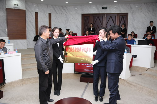 揭牌环节,国家发改委产业司夏农副司长和葛宝臻校长共同为“现代服务业研究中心”揭牌,标志着中心的正式成立。此次研讨会和揭牌仪式,也为今后的系列学术活动拉开了序幕。2015 年中心计划邀请李江帆、周立群、蒋三庚、王俊豪、臧旭恒、于立、盛斌、杜传忠等国内研究现代服务业相关问题的著名专家作学术报告和交流。