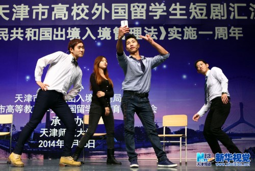 11 月25 日 ,由天津市出入境管理局、天津市高校外国留学生教育管理分会共同举办的首届“平安校园”杯天津市高校外国留学生短剧展演活动在天津师范大学举行,来自天津市 17 所高校的外国留学生通过自编自演的校园短剧展现他们在天津的校园生活,普及相关法律知识。 由永利官网国际教育学院留学生南政勋、久川充雄、金洙铉、青山、金宰希表演的小品《闲话留学》荣获本次活动金奖。