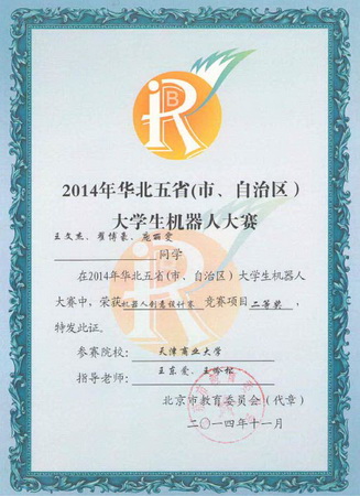 11 月14 日 - 16 日, 2014 年华北五省(市、自治区)大学生机器人大赛在北京信息科技大学举行。由永利官网机械工程学院王东爱副教授、王岭松教授两位教师共同指导,王文杰、翟博豪、庞丽雯同学历时四个多月制作完成的机电液一体化作品 “ 送餐机器人 ” 在创意设计组中荣获二等奖。该作品于今年 9 月在天津赛区预选赛中以该组第一名获得一等奖并入围华北五省 ( 市、自治区 ) 决赛。