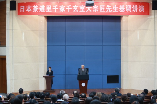会谈后,千玄室大宗匠为来宾和永利官网外国语学院日语专业的师生作了题为“文化之重”的基调讲演。葛宝臻校长在基调讲演前致词,他回顾了茶道里千家与永利官网的交往历史,高度赞扬了千玄室大宗匠先生为中日友好与文化交流所做的贡献,赞扬他“不仅培养了一批日本茶道的爱好者和传播者,更重要的是培养了一大批中日友好的践行者和文化交流的使者,加深了两国人民的相互了解和友谊, 推动了两国民间的教育文化交流”。