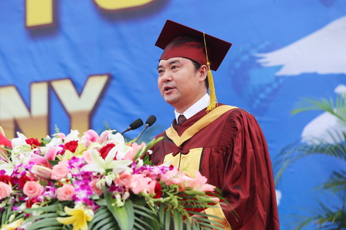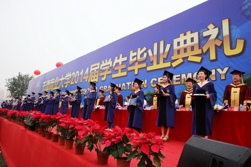 毕业典礼在庄严雄壮的国歌声中拉开帷幕。副校长葛宝臻代表校学位评定委员会宣读2014 届学生学位授予情况决议。校长刘书瀚发表了热情洋溢的讲话,对2014 届毕业生表示祝贺并鼓励同学们在人生新的征程中要始终“坚定理想,立志报国;诚信立世,自强不息;与时俱进,锐意创新;心系母校,共求发展。”