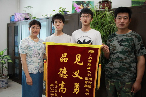 6 月5 日上午,伤者家属李青云来到经济学院为10 级同学周印楼、张露露送来了印有“见义勇为 品德高尚”字样的锦旗和两封感谢信,感谢两位同学的见义勇为。